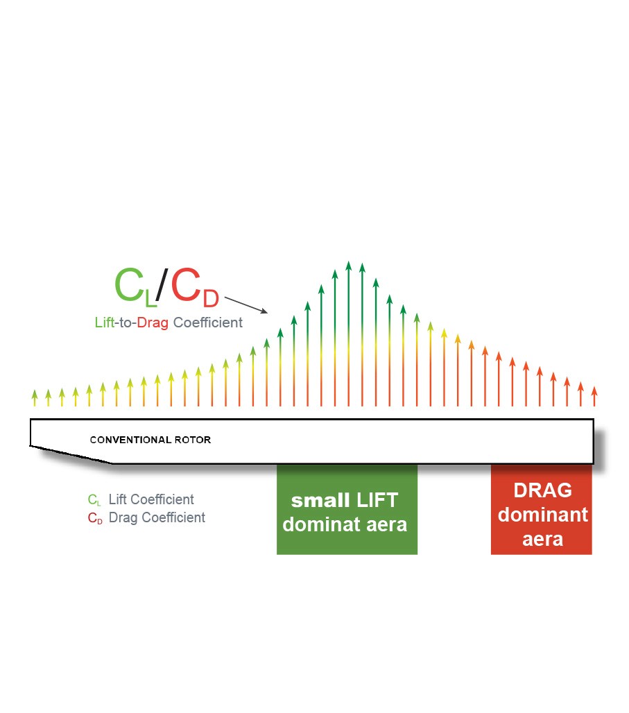 Aerodynamically optimized chord distribution, twisted geometry, and multi-regime airfoil architecture to maximize lift coefficient and rotor efficiency.
